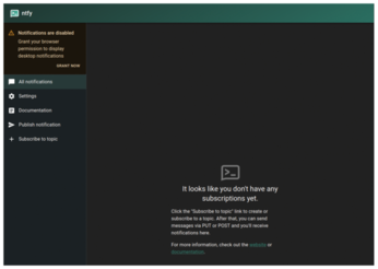 If everything is configured properly, you should be able to access ntfy's web interface on the domain you've specified, such as https://ntfy.example.com. A message will inform you that Notifications are disabled. Click on Grant now to enable notifications in your web browser (Figure 1) and confirm this in the dialog your web browser presents.