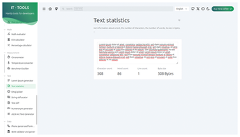 In the Text category, Lorem ipsum generator outputs placeholder text to demonstrate the visual appearance of a document without revealing the actual content. If you are a writer, Text statistics (Figure 6) tells you how many characters, words, and lines your text contains and how big the file size will be. The Text diff tool lets you compare two versions of a text.