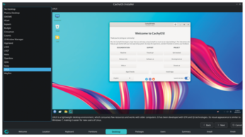 CachyOS allows for customization. Users can choose from several desktop environments via the CachyOS installer including KDE Plasma, Gnome, Xfce, bspwm, Budgie, Cinnamon, COSMIC (first stable release scheduled for December 2025), i3, Hyprland, LXDE, LXQt, MATE Desktop, Openbox, Qtile, Sway, UKUI, and Wayfire.