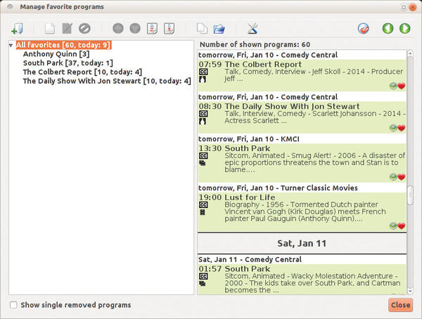 Clicking Add to favorite programs brings up a dialog box that lets you save the program in your list of favorites; however, like many other features in TV-Browser, this feature also offers more. For example, if you click the I like these actors radio button, a drop-down menu appears listing all the participating actors. After making a selection, the desired actor appears as an entry in your list of favorite TV shows (Figure 5). You can access the list by clicking on the heart icon in the main window. From here, you can also see a list of movies in which the actor appears, and the program will notify you in the future when a movie with your favorite actor begins.