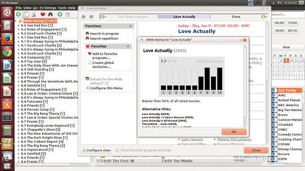 Other extensions expand the information content of the television program. For example, the IMDb ratings plugin adds an IMDb ranking to each program, which displays in the program table at the bottom left.