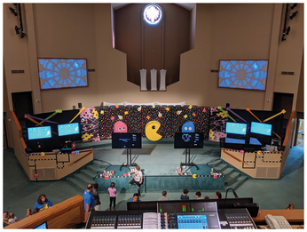 My most recent project that fell in this category was a set of scoreboards for my church's Vacation Bible School. I integrated four large LCD TVs into the set design (Figure 1) and dedicated a Raspberry Pi to each one. Also, I wanted the ability to update each team's score in real time from a centralized console. To accomplish this, I wrote the code for the scoreboards and their controller in Python and communicated between the different screens with Pyro [1].