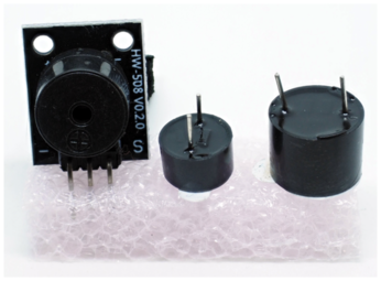 The buzzers themselves look like small black pots with two pins (Figure 1, center and right). For active buzzers, you just need the component itself, but for passive buzzers, it makes sense to use a breakout with the required circuitry (Figure 1, left). There are also breakouts for active buzzers with three pins, but one of them is not assigned in this case. When purchasing, you can use the designation as a guide: Passive buzzers will be known as KY-006 or HW-508, while an active variant often has KY-012 in its name.